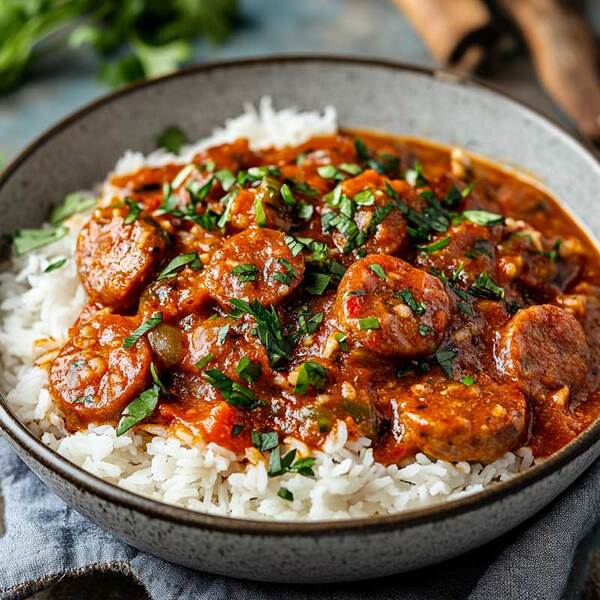 8,00 €Saucisses fumées cuisinées à la tomate, oignons et épices douces. Un classique indémodable, réconfortant et riche en saveurs + riz